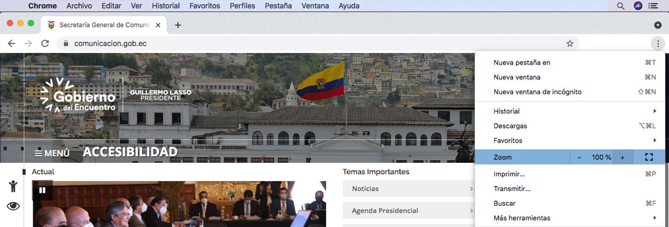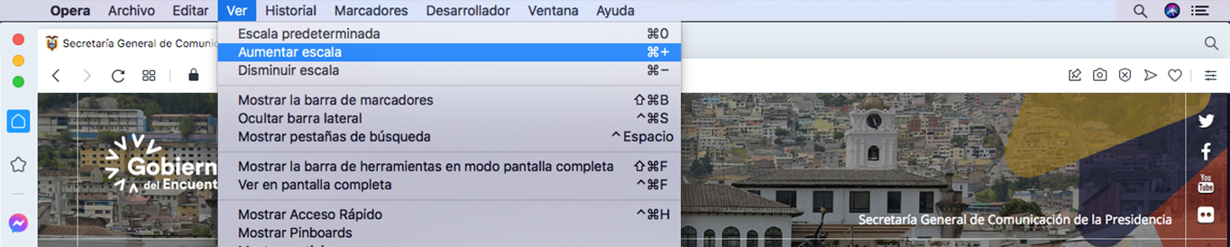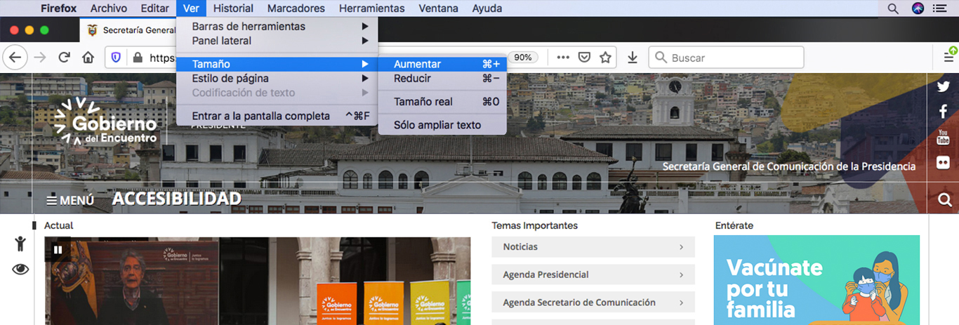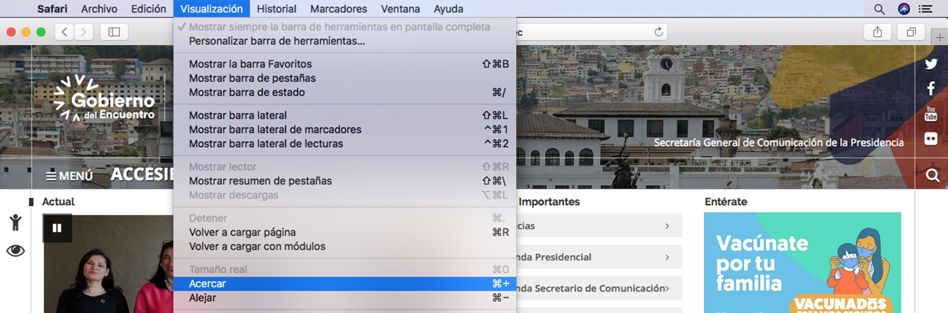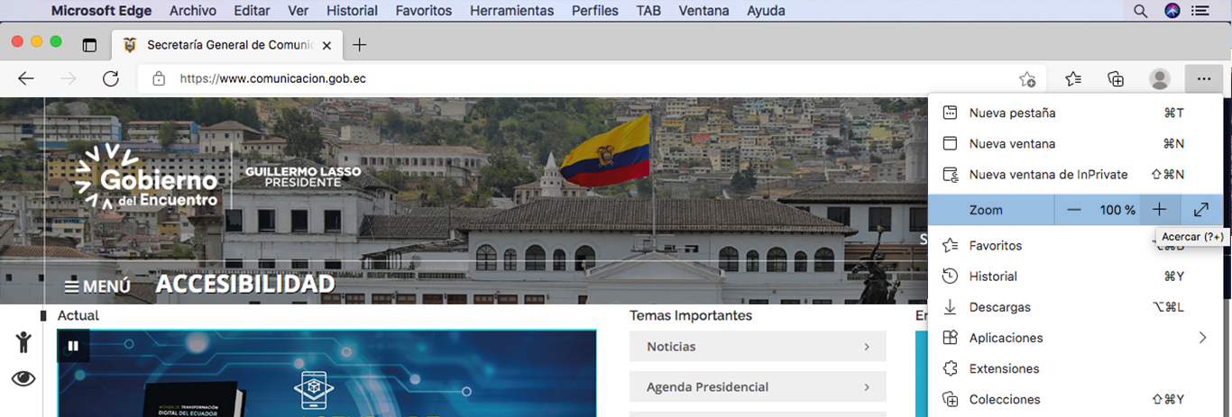 Para usarlo, se va a la parte superior derecha de la ventana, el icono (Menú de la página actual) y se hace clic en el botón Escala (Zoom), allí están las opciones de acercar, alejar y solo hacer zoom al texto.